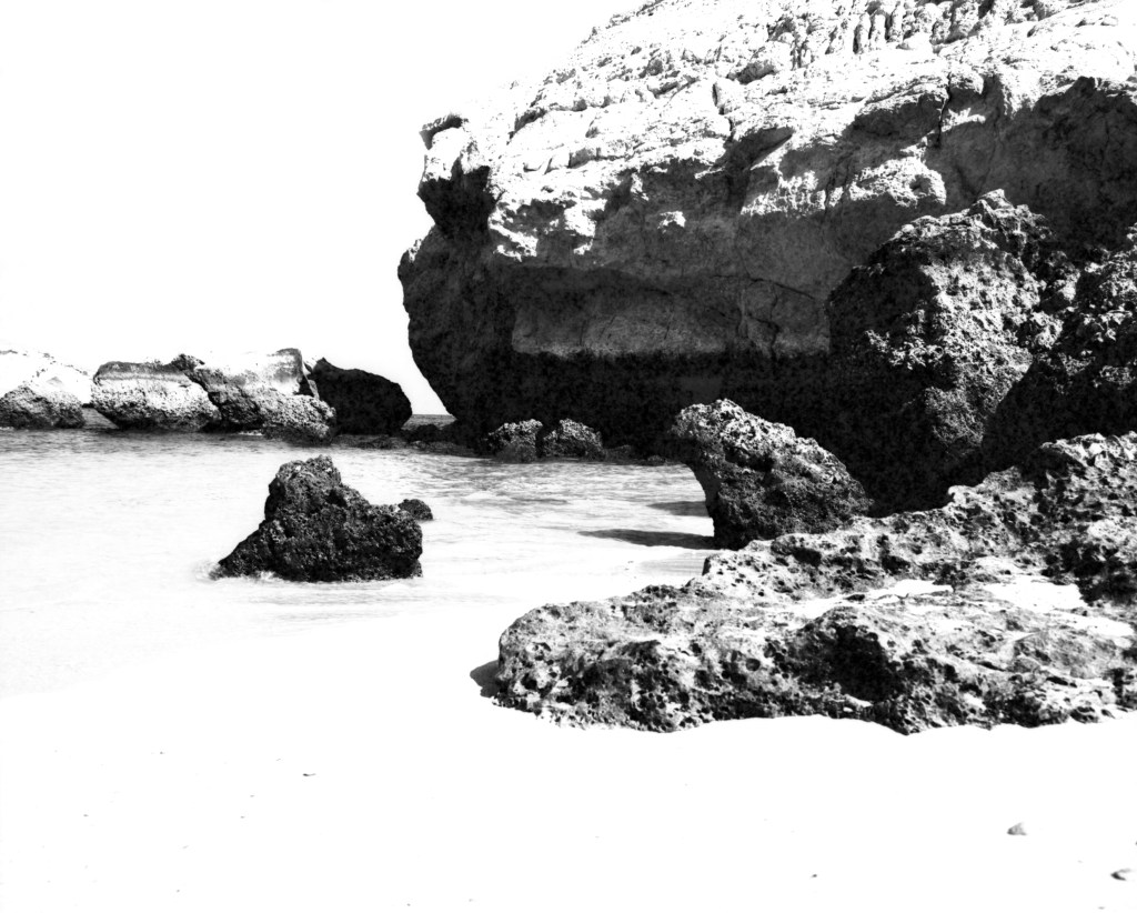 These images use sound recording film as a photographic medium. This very high contrast, fine grain, slightly orthochromatic, slow analogue film stock has been designed for the recording of sound in an optical format in the film industry. Sound recording film offers an unpredictable and slightly ‘alien’ image of a place, distilled to lines and planes privileging highlights and shadows. It has the potential for representing the peripheries of reflected light to record images of places that are far from the flat and flexible ‘perfect photographic negative’ that captures the full range of tones and allows the photographer to control the contrast and tonality in the darkroom. These images leave little room for manipulation in post-production. The captured light cannot be bent at will.